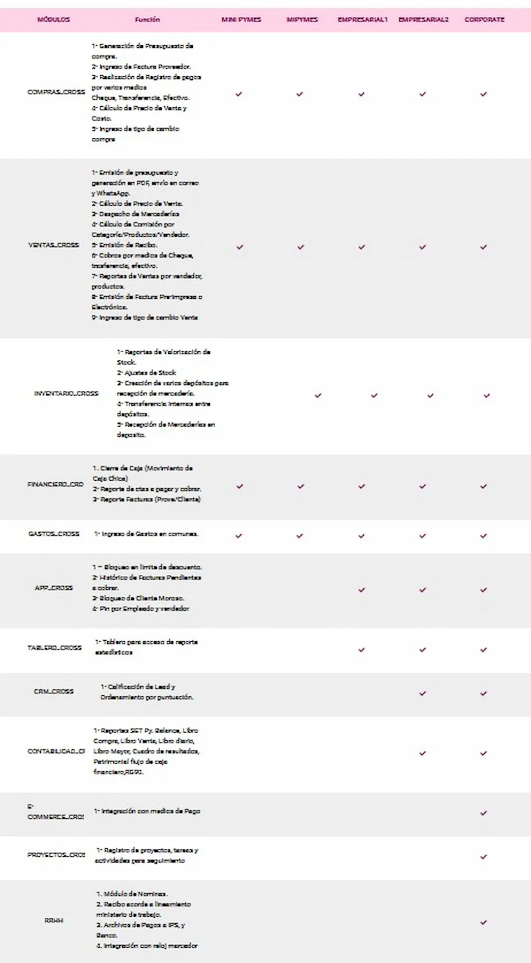 1- Emisión de presupuesto y generación en PDF, envío en correo y WhatsApp. 2- Cálculo de Precio de Venta. 3- Despacho de Mercaderías 4- Cálculo de Comisión por Categoría/Productos/Vendedor. 5- Emisión de Recibo. 6- Cobros por medios de Cheque, trasferencia, efectivo. 7- Reportes de Ventas por vendedor, productos. 8- Emisión de Factura Pre-Impresa o Electrónica. 9- Ingreso de tipo de cambio Venta